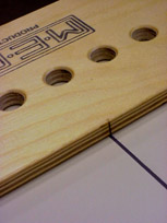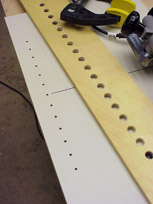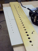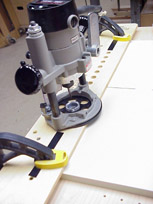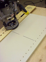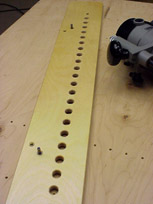 Develop a rhythm, allow the cutter to retract fully after each plunge, then tip the router out of the 5/8" hole and slide it to the next. The 5/8" holes are chamfered so the template guide finds it readily. Allow the router base to seat squarely on the guide before the next plunge. With practice you will be surprised at how quickly a line of holes can be bored.