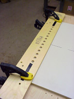With work secured to bench, clamp guide to work piece, aligning index mark to center line and stop pins against edge of work.
