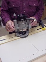 Bore holes. Move router from hole to hole being certain to allow the cutter to retract fully into the router base after each plunge.
