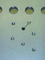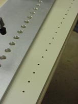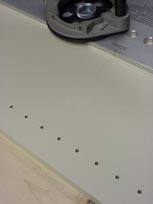 Develop a rhythm, allow the cutter to retract fully after each plunge. then tip the router out of the 5/8" hole and slide it to the next. The 5/8" holes are chamfered so the template guide finds it readily. Allow the router base to seat squarely on the guide before the next plunge. With practice you will be surprised at how quickly a line of holes can be bored.